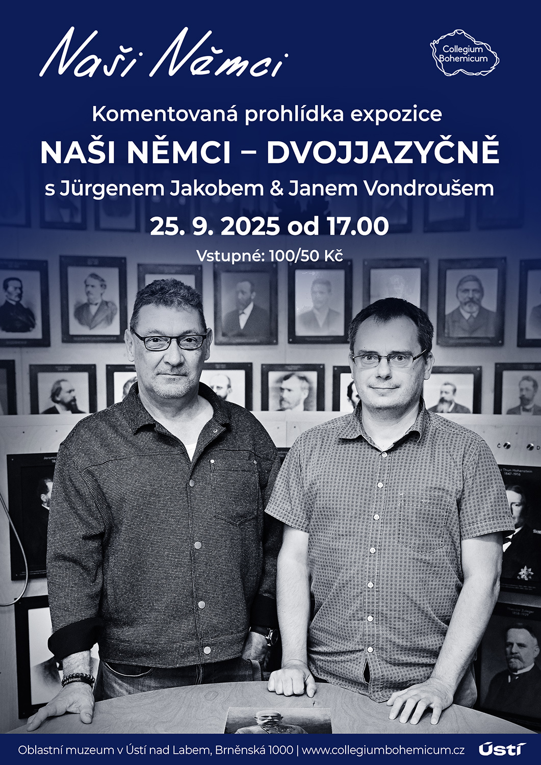 Dne 25. 9. 2025 se koná další komentovaná prohlídka podporovaná Magistrátem města Ústí nad Labem. Tentokrát však nebude zaměřena tematicky, nýbrž bude se dvěma průvodci a to v jazyce českém a německém. Pokud tedy máte nějakého známého, kdo by si raději prohlédl výstavu Naši Němci s německým komentářem, je srdečně zván!
